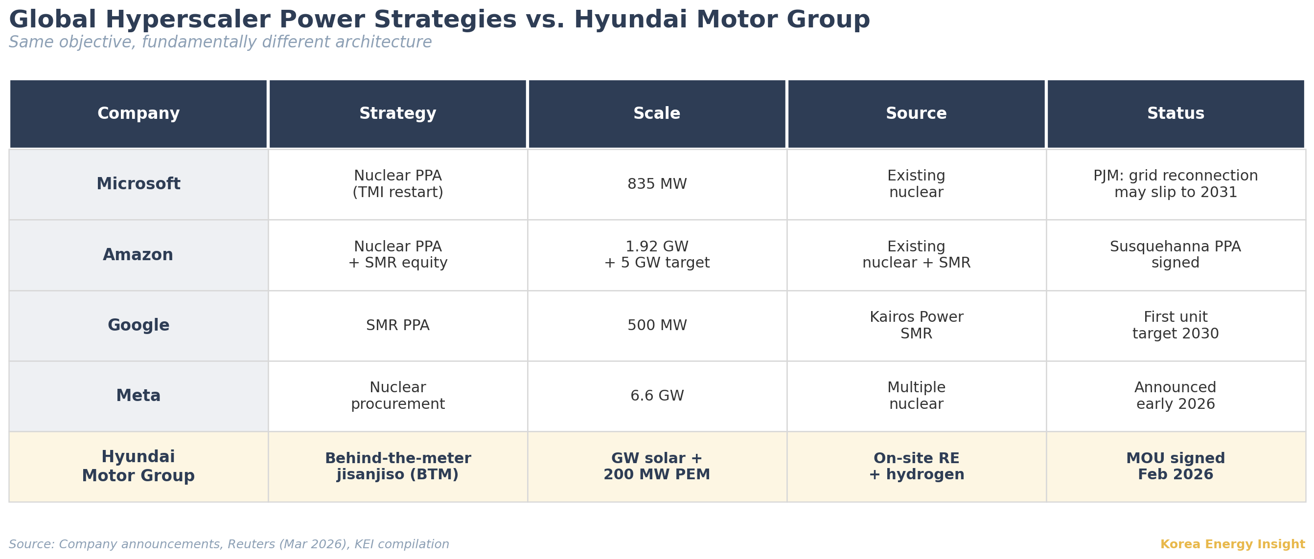 Hyundai’s problem is not unique. Every hyperscale data center operator in the world is scrambling for dedicated, carbon-free baseload power. What differs is the solution set available.