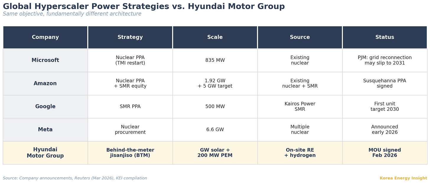 This is the constraint that makes Hyundai’s approach structurally different from what US hyperscalers are doing. Microsoft can contract for existing nuclear baseload. Hyundai cannot. The Korean market offers no mechanism for a corporate buyer to secure dedicated 24/7 carbon-free power from the grid. So Hyundai is building its own power supply from scratch — solar for daytime, hydrogen for storage, fuel cells for dispatch — inside the fence. It is the same objective as Microsoft’s Three Mile Island deal, pursued through an entirely different architecture because the market design leaves no alternative.