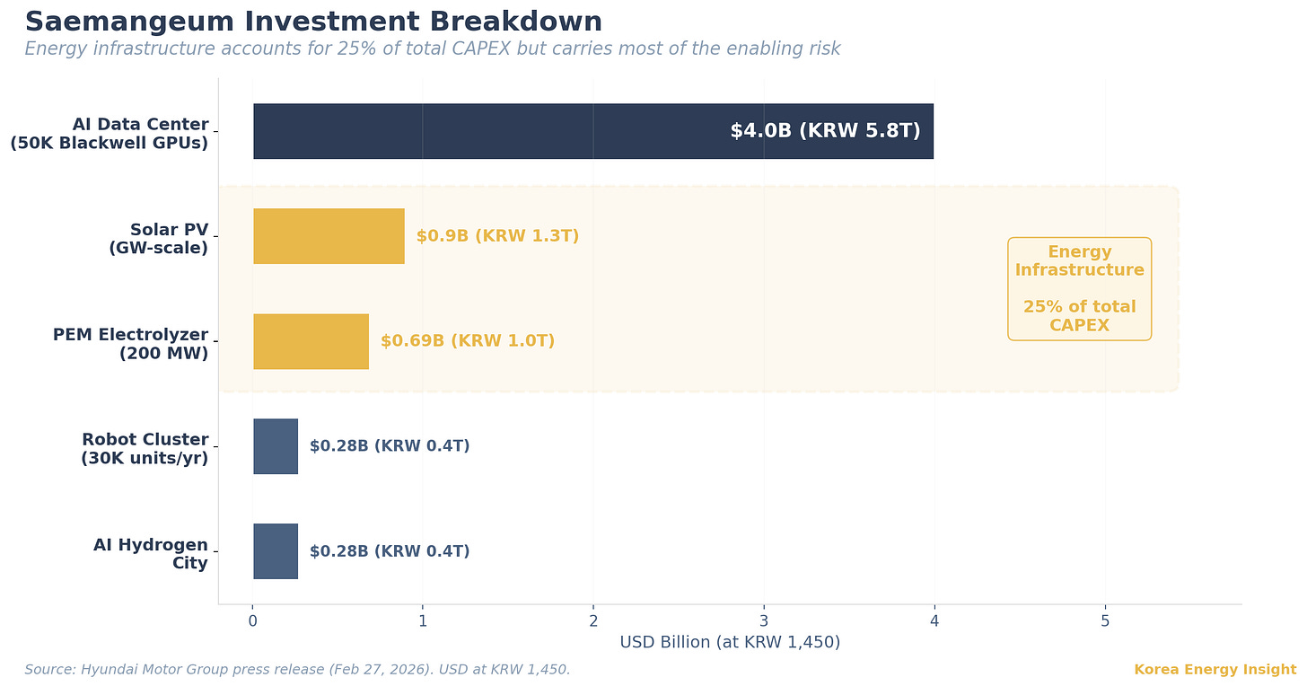 The breakdown tells the story. An AI data center with 50,000 NVIDIA Blackwell GPUs takes $4 billion (KRW 5.8 trillion). A GW-scale solar PV portfolio takes $900 million (KRW 1.3 trillion). A 200MW PEM electrolyzer takes $690 million (KRW 1 trillion). A robot manufacturing cluster — targeting 30,000 units annually, spanning humanoid, logistics, and wearable robots — takes $276 million (KRW 400 billion). An AI hydrogen city takes another $276 million. The energy components account for 25% of total spending but carry most of the enabling risk.