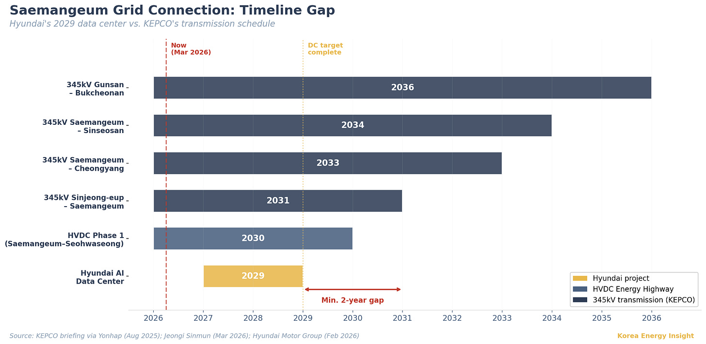 Third, it puts a concrete number on the political economy of Korean industrial policy. The 9 trillion won MOU was signed within Lee Jae-myung’s first year in office, with Jeonbuk, a core political constituency, as the beneficiary. Government support is obvious. The harder question is whether that support turns into steel, cable, permits, and financing on Hyundai’s clock rather than Seoul’s. The government’s planned West Coast Energy Highway is a multi-segment HVDC buildout phased to 2038. The first segment, roughly 220 km from Saemangeum to Seohwaseong, targets 2030 completion (전기신문, Mar 2026). Hyundai’s data center targets 2029. Those timelines need to converge.