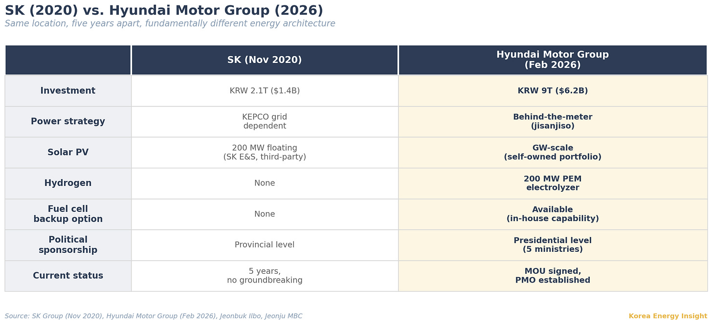 The 지산지소 structure changes the grid dependency equation. Hyundai’s model generates and consumes power within the same complex, and has the option to deploy its own fuel cells as a nighttime supply layer — a technological fallback SK never had. The 345kV bottleneck that stopped SK becomes less binding, though KEPCO grid connection will still matter for redundancy and seasonal backup.