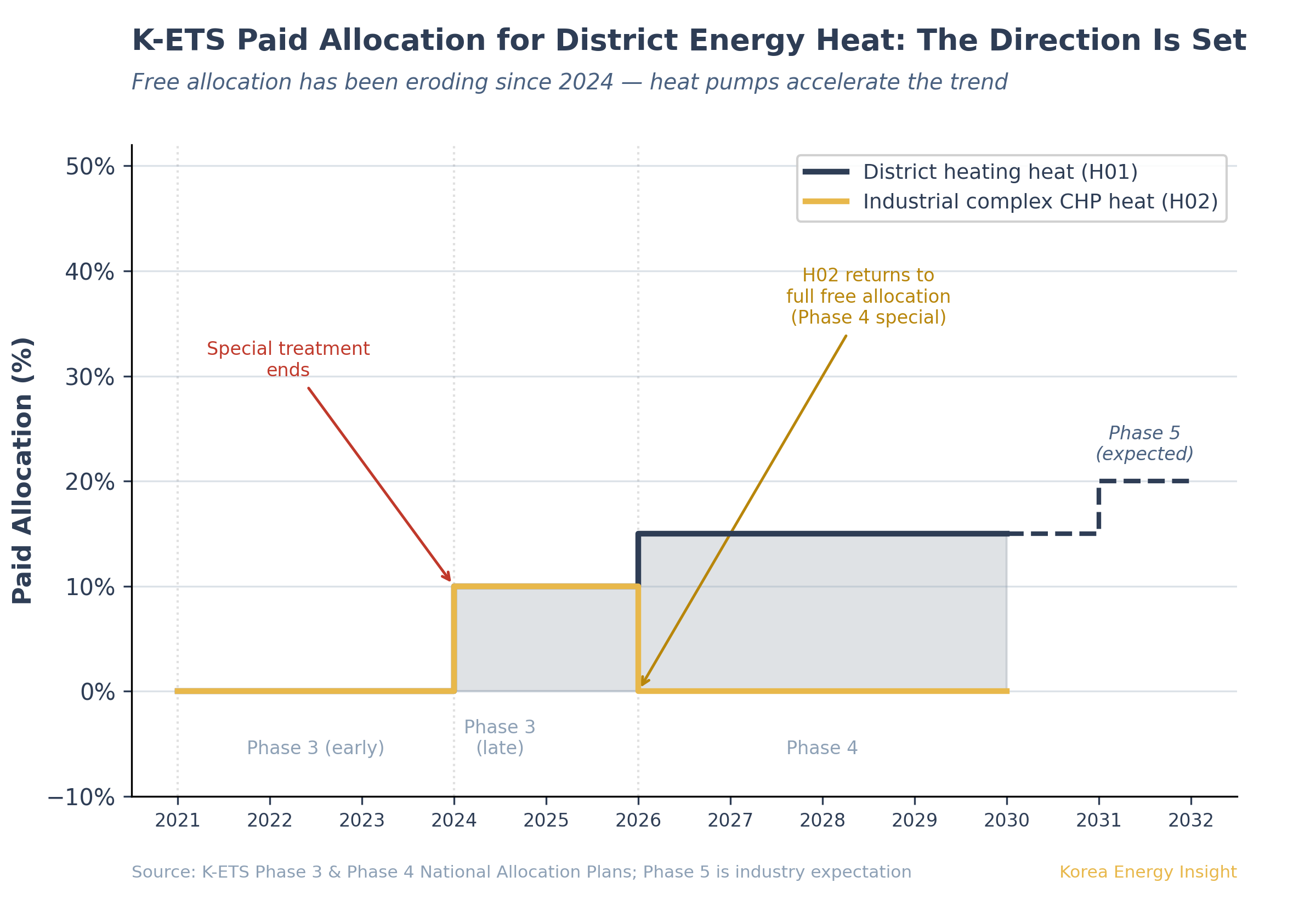 The first sector to feel pressure is city gas, not district energy — heat pumps will displace individual gas boilers outside supply zones first. But the medium-term question is structural. At the start of K-ETS Phase 3, district energy heat was effectively fully free-allocated. By 2024, that had already shifted to 10% paid allocation. Phase 4 (2026–2030) deepens the trend to 15% for district heating heat, while industrial complex CHP heat retains full free allocation as a special category. Industry sources expect further increases in Phase 5. Heat pumps accelerate this direction — if they become a viable zero-direct-emission alternative, the parity argument that justified free allocation weakens further.