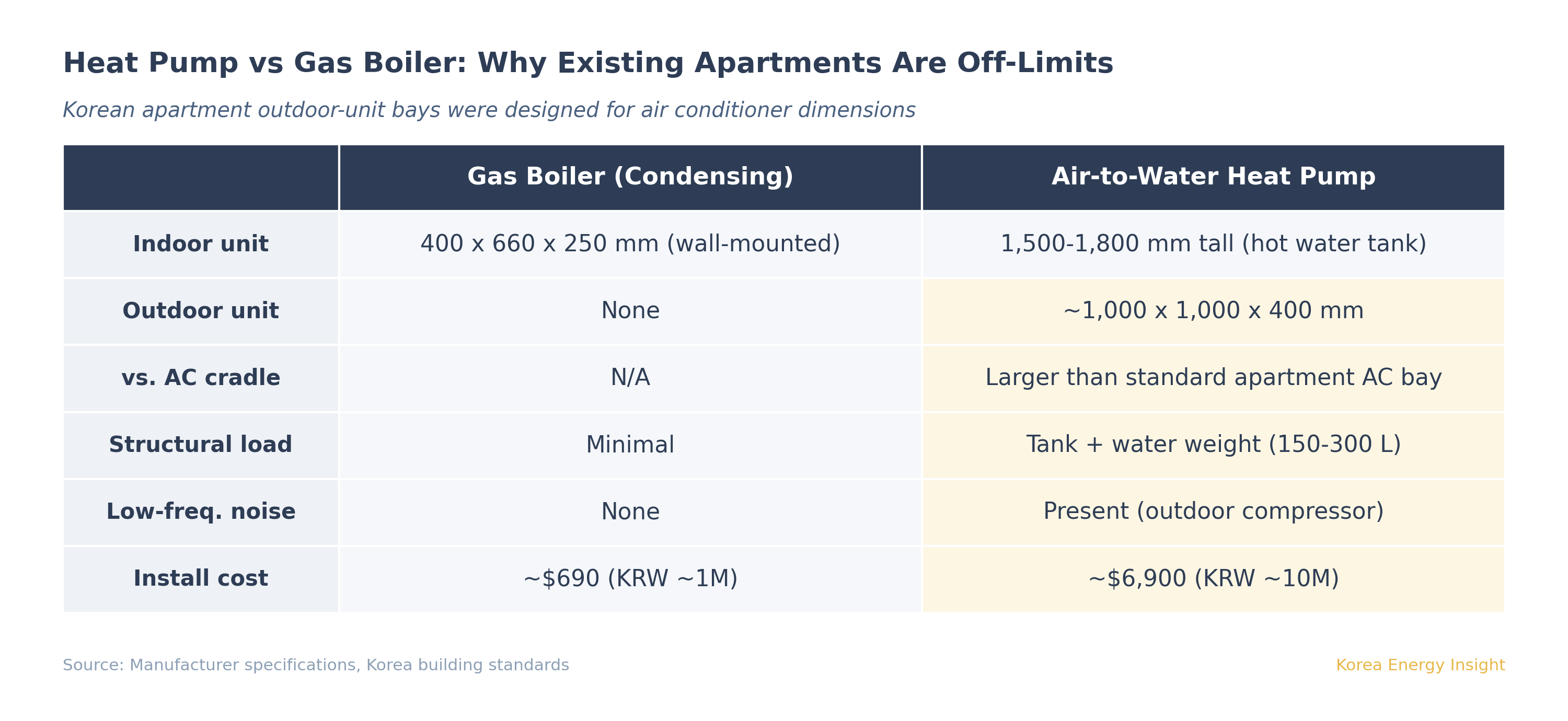 The government appears to understand this. Its initial deployment targets warm-climate regions — Jeju and Gyeongnam — and detached houses with rooftop solar, not Seoul apartments. The physical constraints explain why. A wall-mounted gas boiler measures roughly 400×660×250mm with no outdoor unit. An air-to-water heat pump requires an outdoor unit approximately 1,000×1,000×400mm — larger than a standard apartment air conditioner cradle — plus an indoor hot water storage tank standing 1,500–1,800mm tall. Korean apartment outdoor unit bays were designed for air conditioner dimensions, and the additional weight of a water tank raises structural load concerns for existing buildings. Low-frequency noise from outdoor units adds a further barrier. For existing apartment complexes, retrofit installation is extremely difficult.