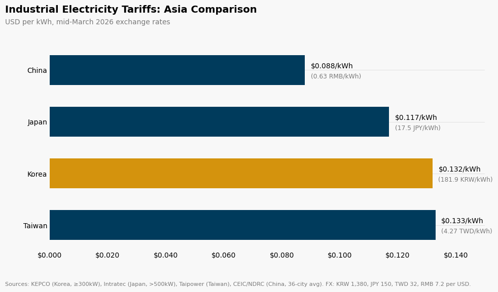 Using mid-March 2026 exchange rates (KRW 1,380, JPY 150, TWD 32, RMB 7.2 per USD) and published industrial tariff benchmarks, Korea’s industrial rate now stands at approximately $0.132/kWh — virtually identical to Taiwan’s $0.133/kWh (Taipower, NT$4.27/kWh), which Taipower has held steady precisely to protect its semiconductor and electronics manufacturers. Korea is now more expensive than Japan’s industrial rate of roughly $0.117/kWh (Intratec, >500kW) and carries a 50% premium over China’s $0.088/kWh (CEIC/NDRC, 36-city average, 35kV+, ~0.63 RMB/kWh). Four years ago, Korea’s low industrial electricity price was a selling point for foreign manufacturers. That advantage is gone.
