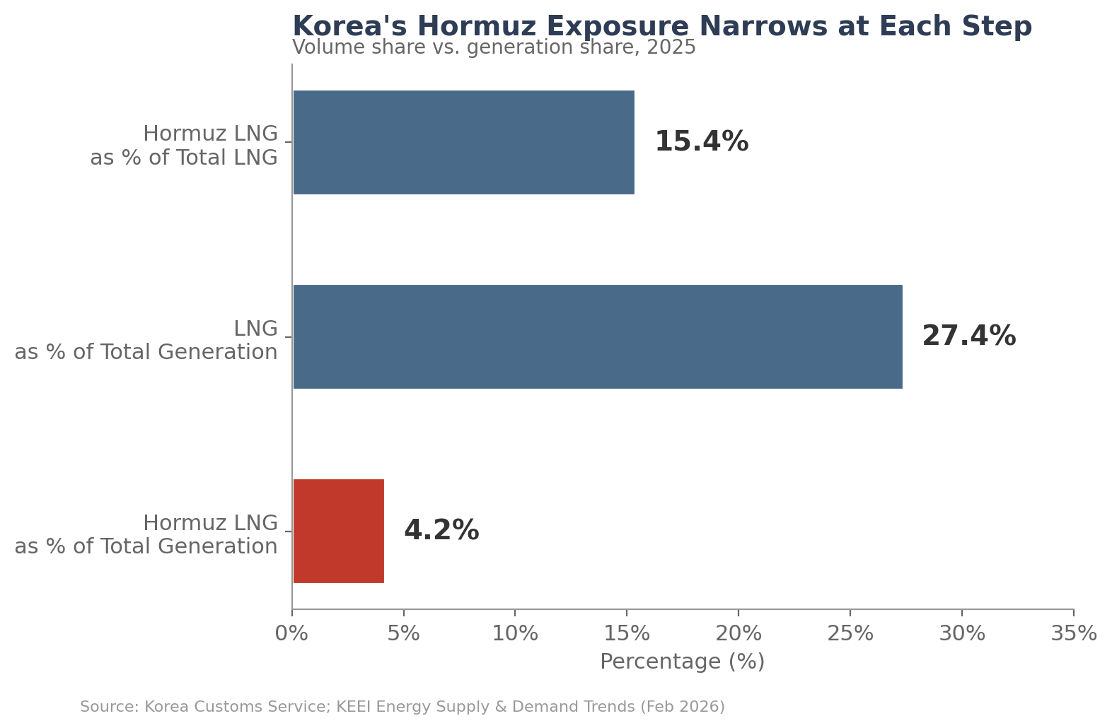 The implication is direct. When a Hormuz crisis pushes crude oil above $100/barrel, the price increase feeds through to the majority of LNG Korea imports — regardless of where it was loaded. Australian LNG from Gladstone, US LNG from Sabine Pass, Malaysian LNG from Bintulu — term contracts reprice upward through the same oil-linked formula. The physical volume at risk is 15.4%. The price impact is system-wide.
