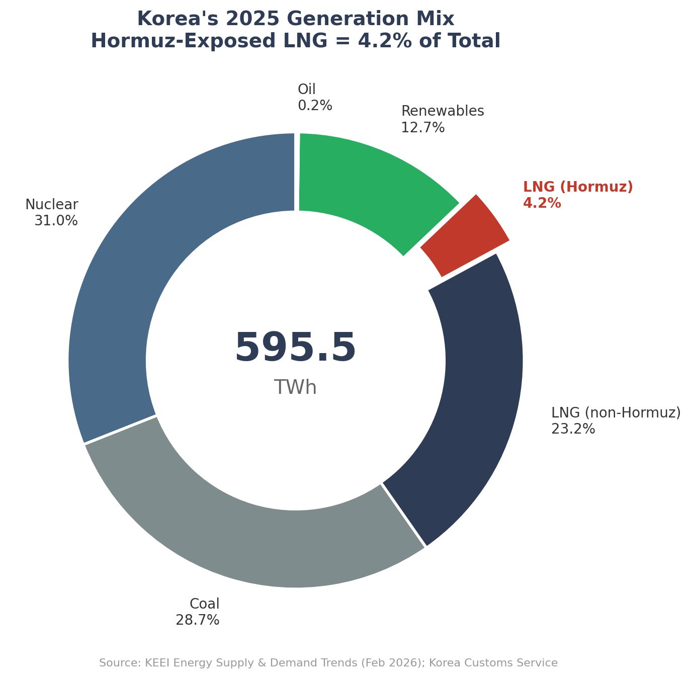 Korea’s 2025 LNG imports totalled 46.7 million tonnes (Korea Customs Service). Of that, 7.2 million tonnes — Qatar and UAE combined — transited the Hormuz Strait. That is 15.4% of Korea’s LNG supply. Not trivial. But the claim that this exposure translates into a generation shortfall requires a second step: converting volume into electricity. LNG accounted for 27.4% of Korea’s 595.5 TWh of generation in 2025 (Korea Energy Economics Institute(KEEI), Energy Supply and Demand Trends, February 2026). Hormuz-exposed LNG’s share of total generation: 4.2%. A full Hormuz blockade — a scenario that did not materialize even during the 1980–88 Iran–Iraq War — would put 4.2% of Korea’s power output at risk. The remaining 95.8% of Korea’s generation does not depend on Hormuz-exposed LNG. It comes from nuclear (31.0%), coal (28.7%), non-Hormuz LNG, renewables (12.7%), and a negligible oil component.