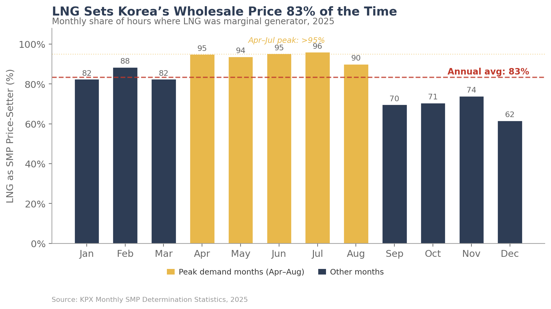 That repriced LNG cost transmits directly into Korea’s wholesale electricity price. Korea operates CBP (cost-based pool) where generators bid their variable costs and the marginal unit sets the SMP (System Marginal Price) for all dispatched generators in each hour. In 2025, LNG-fired generators set the SMP in 83% of all hours (KPX, Monthly SMP Determination Statistics). During April through July — peak demand months — that share exceeded 95%.