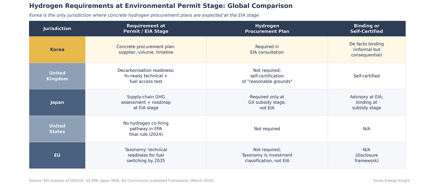 No major jurisdiction requires developers to name hydrogen suppliers, specify volumes, and commit delivery timelines as a condition of environmental permit approval, as far as publicly available regulatory frameworks show. The UK comes closest: its decarbonisation readiness framework, effective February 2026, requires new plants to demonstrate hydrogen fuel access — but this is self-certified, not independently verified. Japan’s EIA process asks for supply-chain-wide GHG assessments and decarbonization roadmaps, but concrete procurement dossiers are required only at the GX subsidy stage, not the environmental permit stage. The reason Korea is out ahead is structural: no other OECD country has committed to both phasing out coal and cutting power-sector emissions by up to 75% within a decade. That combination funnels all decarbonization pressure onto LNG — and from there, onto hydrogen.