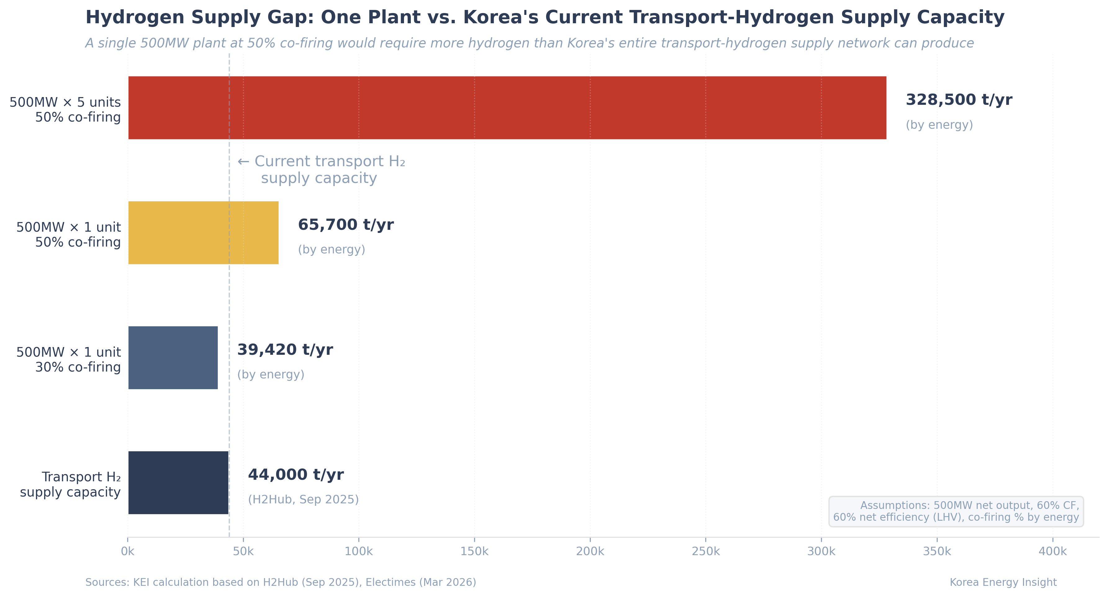 In March 2026, Korea’s climate change impact assessment process — conducted alongside the environmental impact assessment (EIA) for new power projects — entered new territory. Developers building new LNG combined cycle plants report that the Ministry of Climate, Energy and Environment (MCEE) is no longer accepting hydrogen co-firing roadmaps at face value. The ministry is increasingly expecting concrete procurement plans: which supplier, what volume, by when. In some cases, according to developers involved in recent EIA consultations, the required co-firing ratio has reached 50% by energy. For a 500MW plant at 60% capacity factor and 60% net thermal efficiency (LHV basis), that means roughly 66,000 tonnes of hydrogen per year (Electimes, March 21, 2026; KEI calculation).