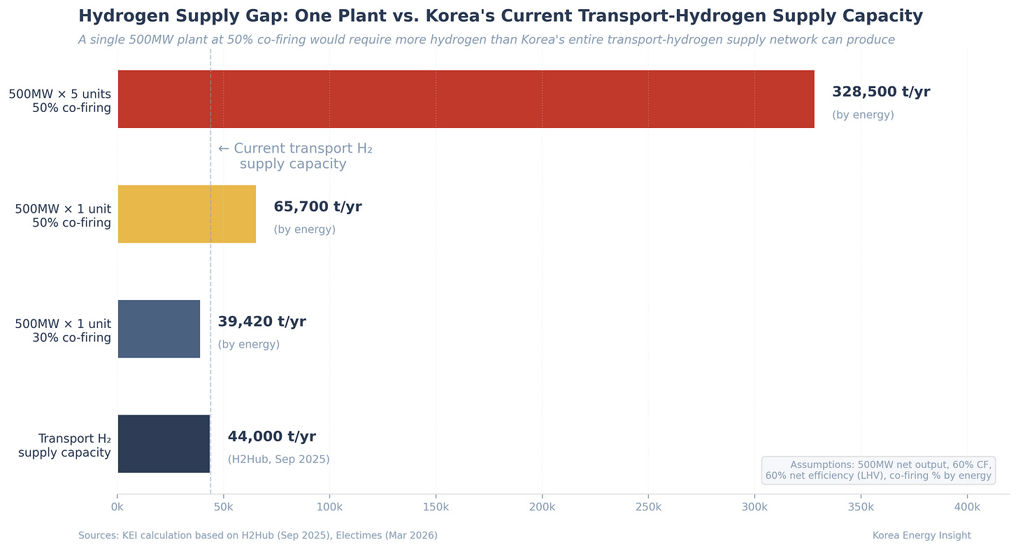 That figure alone frames the problem. Korea’s dedicated transport-hydrogen supply infrastructure has an annual production capacity of about 44,000 tonnes (H2Hub, September 2025). One plant, half-hydrogen, would exceed it.