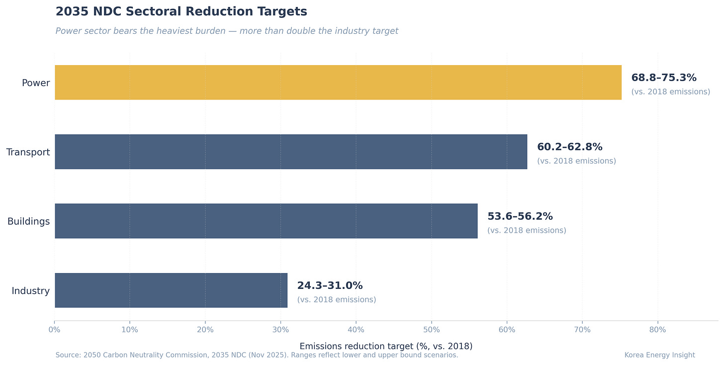 Korea’s coal-retirement push closed that door. In Korea’s policy mainstream, coal is a phase-out story, not a retrofit story — which means ammonia co-firing for coal plants makes no commercial sense. That leaves LNG as the sole fossil fuel in Korea’s long-term generation mix, and hydrogen as the decarbonization pathway that regulators are now testing at the permit stage. The 2035 Nationally Determined Contribution (NDC), finalized in November 2025, sets the power sector’s emissions reduction target at 68.8–75.3% from 2018 levels — more than double the 24.3–31% target for industry (2050 Carbon Neutrality Commission).