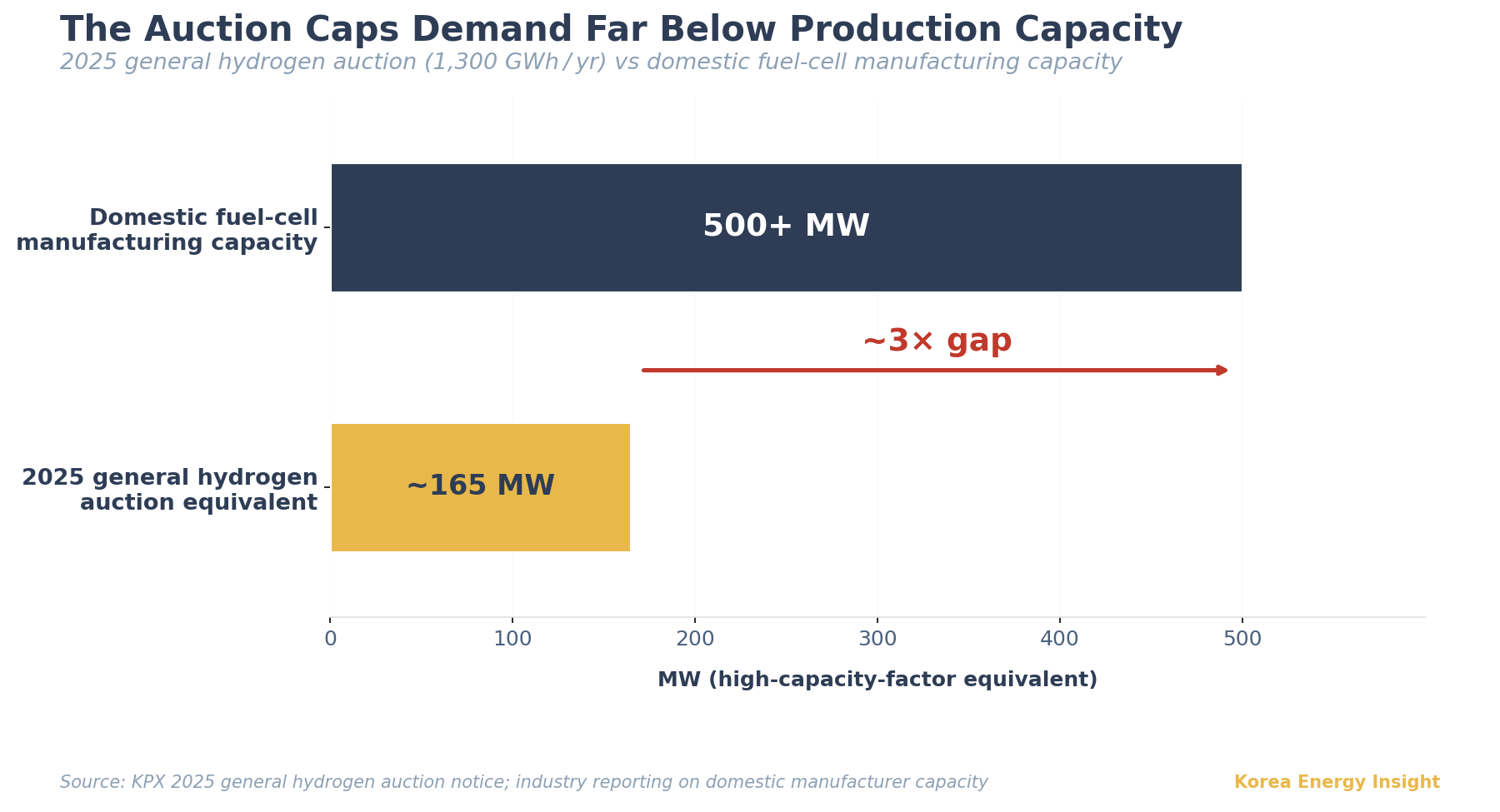Energy policy authority transferred from MOTIE to the newly established Ministry of Climate, Energy and Environment in October 2025. The new ministry still classifies fuel cells as a distributed energy resource under CHPS, and that classification is enforced through bidding rules. The general hydrogen auction does not impose a hard 40 MW unit cap, but creates an effective 40 MW sizing boundary through distributed-generation scoring. Projects connected to the same substation, and same-owner sites within close proximity, lose distributed-generation points once aggregated capacity exceeds 40 MW. The 2025 general hydrogen auction opened at 1,300 GWh per year, equivalent to less than 200 MW of high-capacity-factor fuel-cell capacity, well below the combined manufacturing capability of Korea’s domestic fuel-cell suppliers.