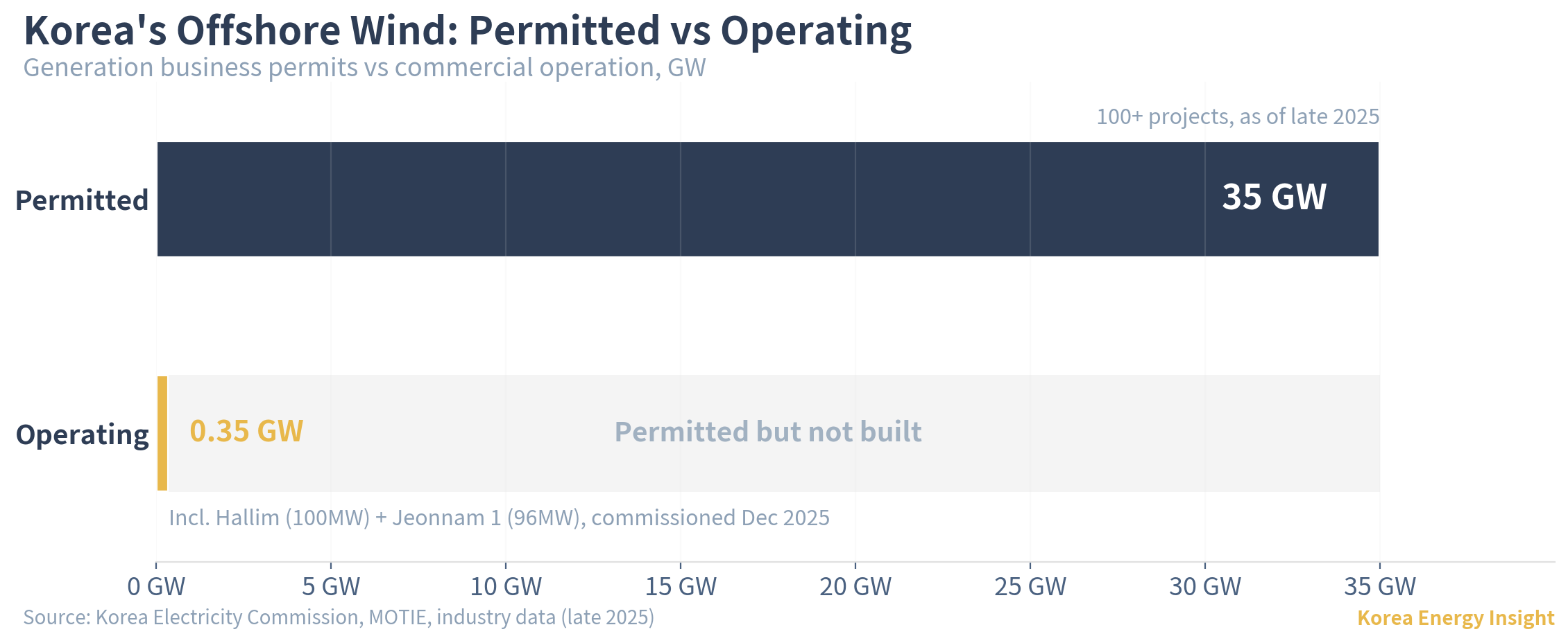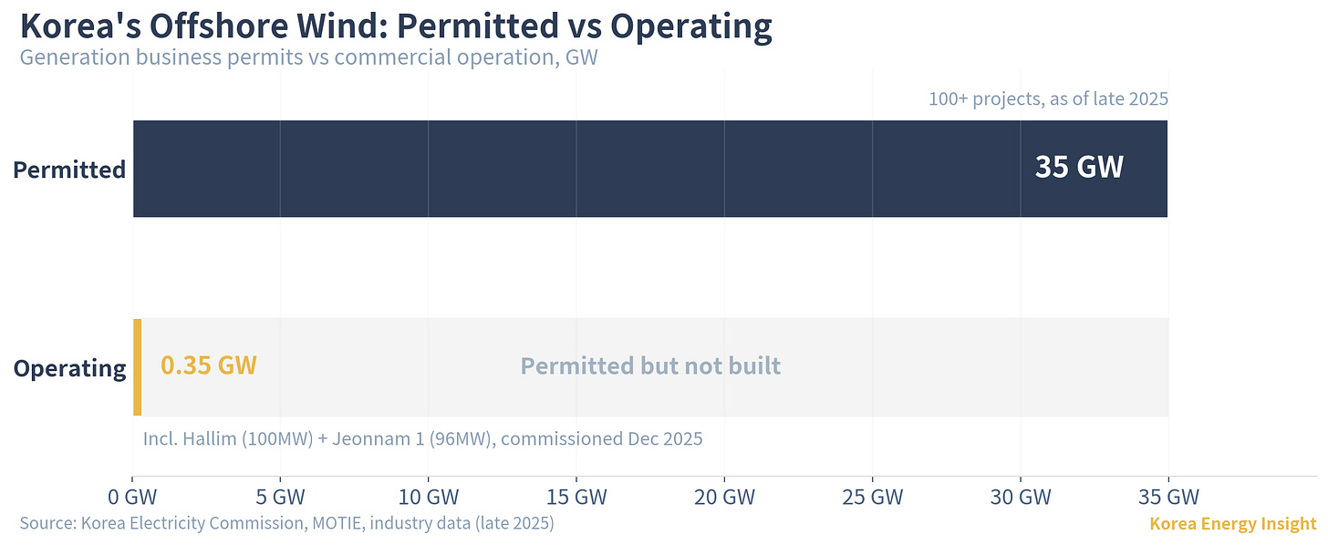 Korea’s offshore wind pipeline looks impressive on paper. As of late 2025, over 100 projects totaling more than 35GW have received generation business permits (발전사업허가) from the Korea Electricity Commission (전기위원회). Actual installed and operating capacity tells a different story. Including the recently commissioned Hallim (100MW) and Jeonnam 1 (96MW), Korea’s total operating offshore wind stands at roughly 0.35GW. After a decade of permitting, the country has 35GW approved and 0.35GW operating.