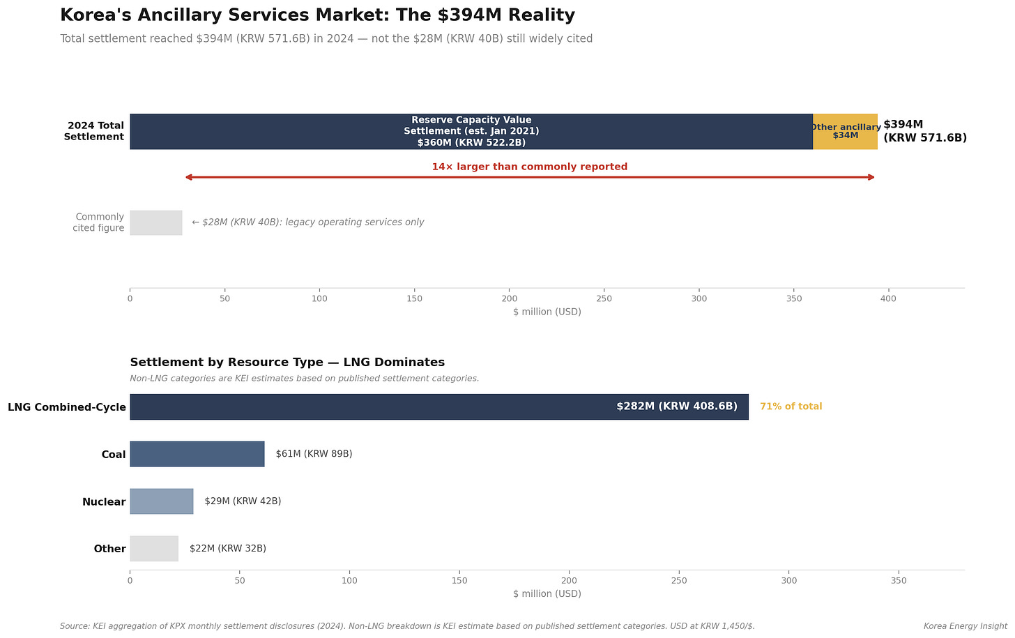 The ancillary services market is the least visible but most immediate channel. Based on KEI’s aggregation of KPX monthly settlement disclosures, Korea’s total ancillary service settlement in 2024 reached $394 million (KRW 571.6 billion) — not the $28 million (KRW 40 billion) figure still cited in some market overviews. The difference is the reserve capacity value settlement, introduced in January 2021, which accounted for $360 million (KRW 522.2 billion) alone. This settlement primarily recognized the value of services that generators were already providing — automatic generation control (AGC) and governor-free (GF) frequency response. As the ancillary services framework matures, more diverse services are expected to be defined, priced, and procured separately. LNG combined-cycle plants received $282 million (KRW 408.6 billion) of the total — making them the single largest beneficiary of Korea’s ancillary services regime. From my years in policy and project development, there is a catch that is not immediately visible: the capacity payment formula already deducts expected ancillary income from the reference capacity price. The net revenue picture is more complex than a simple addition of new income streams.
