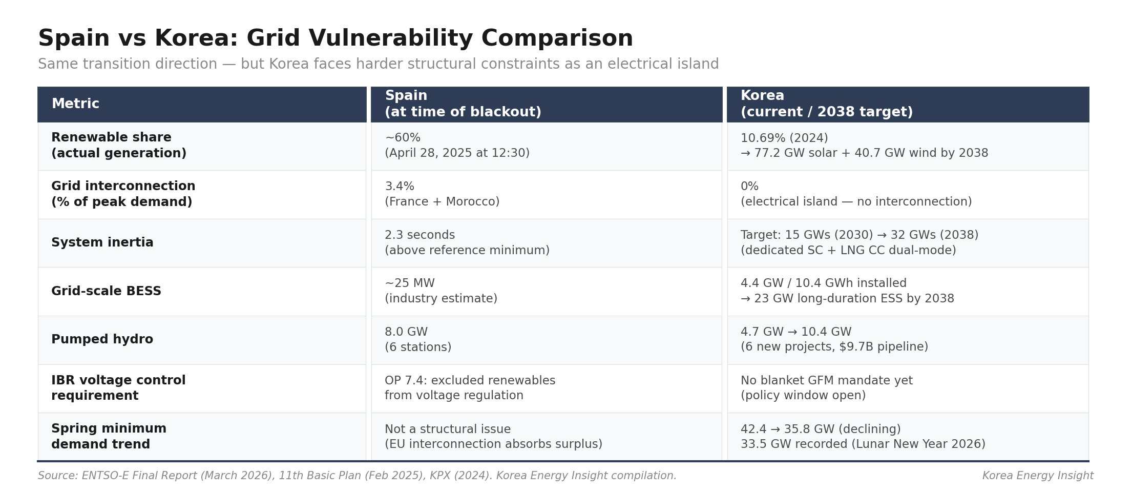 The political framing reassures. The engineering diagnosis tells you where the money needs to go. Renewable expansion is both inevitable and justified — decarbonization targets, energy security concerns from LNG supply chain risks to the Hormuz chokepoint, and declining generation costs all point in one direction. The question is not whether renewables will scale. The question is whether the grid infrastructure and market design are scaling with them. In Spain, they were not. The grid stability bill came due, and no one had budgeted for it. Korea is pursuing the same transition on harder terms — faster renewable targets, shrinking spring demand, and zero interconnection.