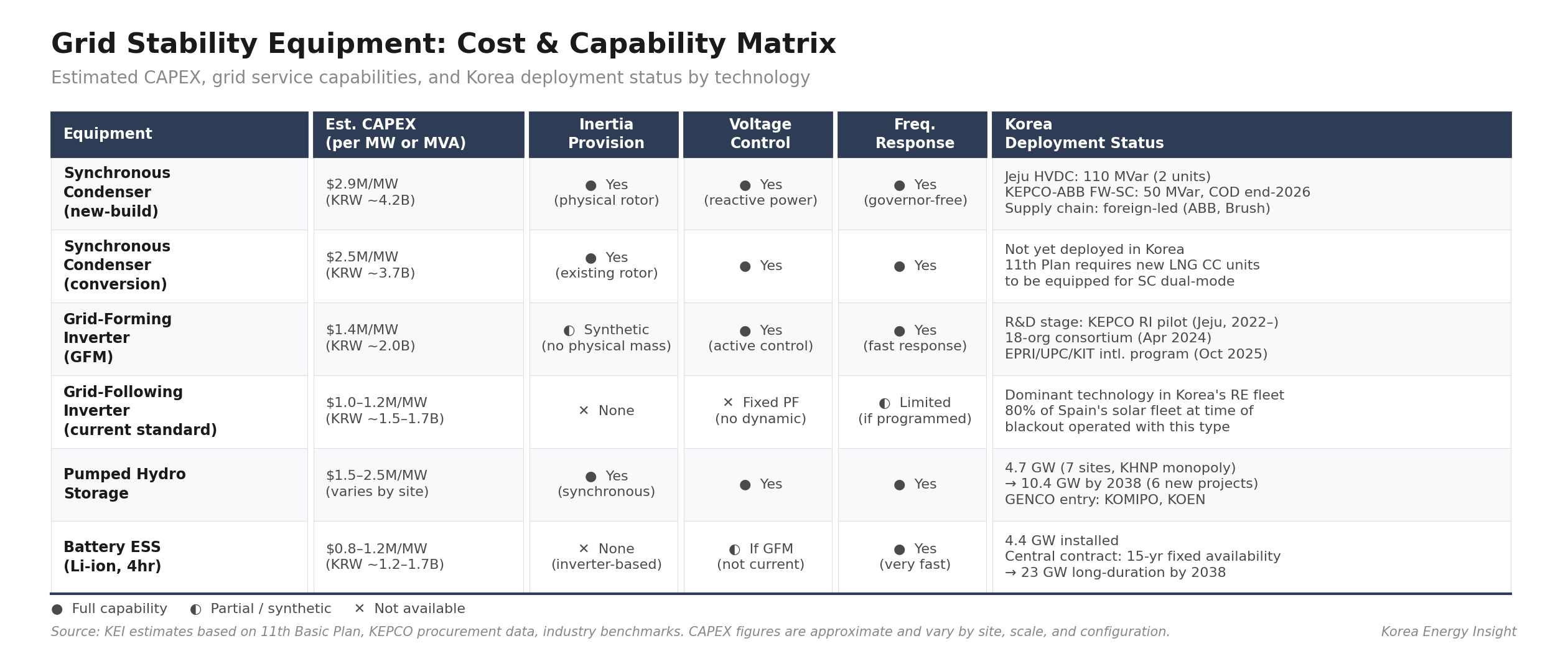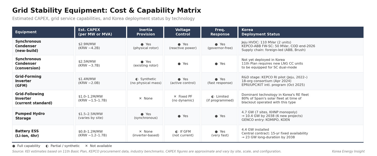 First, renewable project economics will absorb higher CAPEX. As grid-forming requirements, voltage control obligations, and curtailment-compensation mechanisms tighten, the cost of connecting inverter-based resources to the grid will rise. Developers modeling Korean projects should already be stress-testing for rising grid-connection costs. The regulatory trajectory is moving toward stricter IBR requirements — the only question is timing. The CAPEX premium for grid-forming over grid-following inverters is currently estimated at roughly $1.4 million/MW (KRW ~2 billion) versus up to $2.9 million/MW (KRW ~4.2 billion) for synchronous condensers — but the premium will narrow as scale and competition increase.