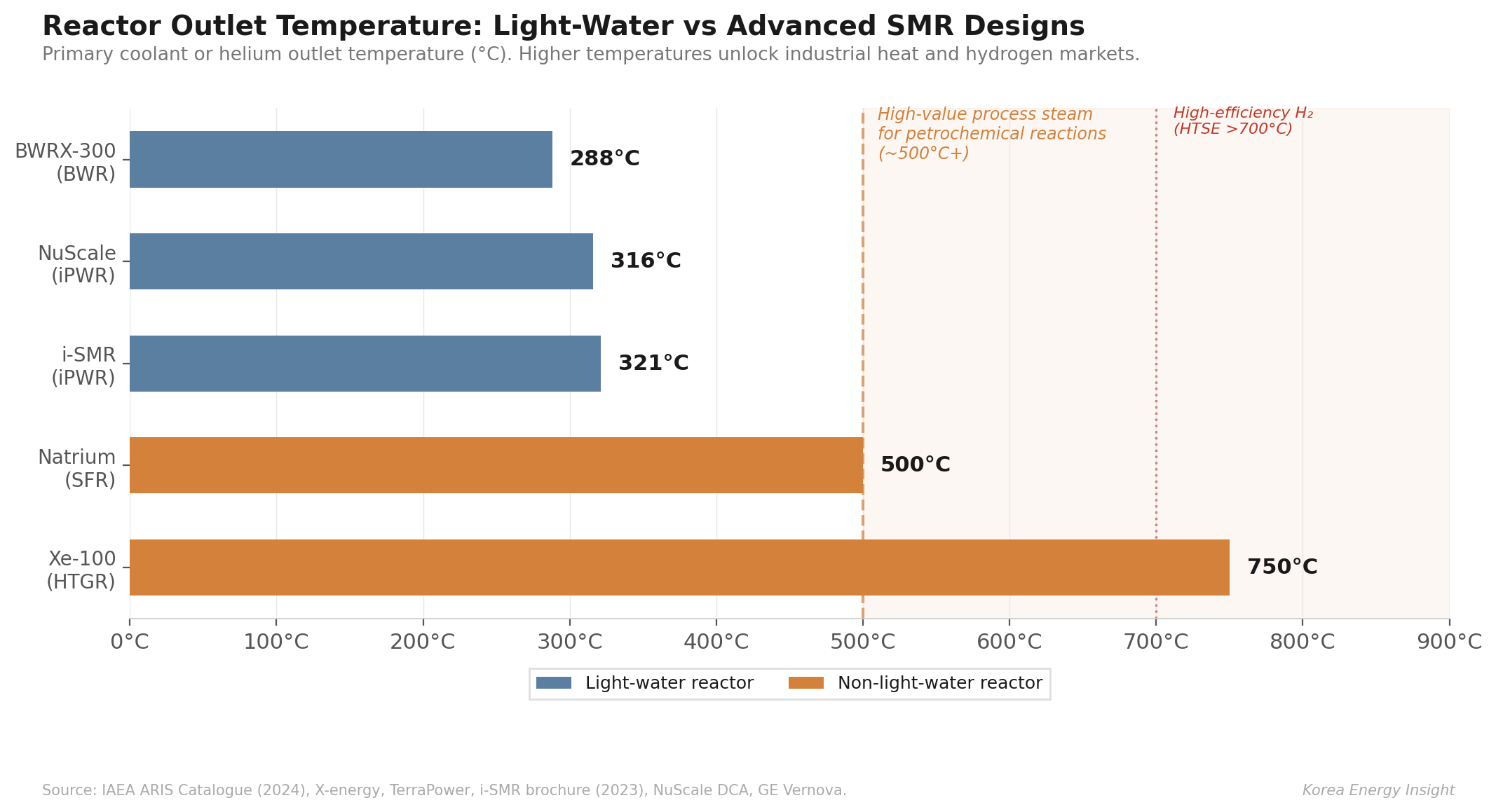 The value paths that could justify a $15,000–20,000/kW premium — high-temperature industrial heat, efficient hydrogen production — require temperatures that light-water physics cannot deliver. High-value process steam for petrochemical high-temperature reactions runs above 500°C, and applications like steelmaking and cement demand 700°C or more. High-temperature steam electrolysis reaches system efficiencies above 90% at 850°C. Korea’s i-SMR operates at 321°C. NuScale reaches 316°C. X-energy’s Xe-100, a high-temperature gas reactor, produces helium at 750°C. TerraPower’s Natrium, a sodium-cooled fast reactor, operates above 350°C with integrated molten salt storage. The temperature gap is not incremental — it determines whether an SMR can access high-value markets beyond electricity or is confined to generation alone. (IAEA ARIS Catalogue, 2024; X-energy; TerraPower; DOE electrolysis targets)