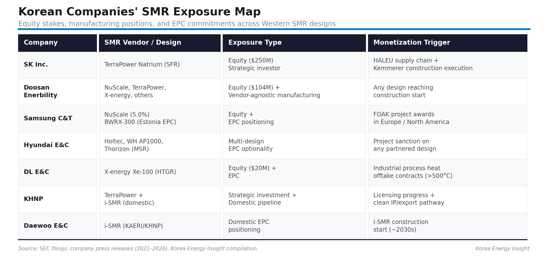 Korean builders, manufacturers, and energy companies have responded with a strategy unprecedented in the country’s nuclear history. Rather than backing a single design, they are positioning across the entire Western SMR field — and putting equity behind it.
