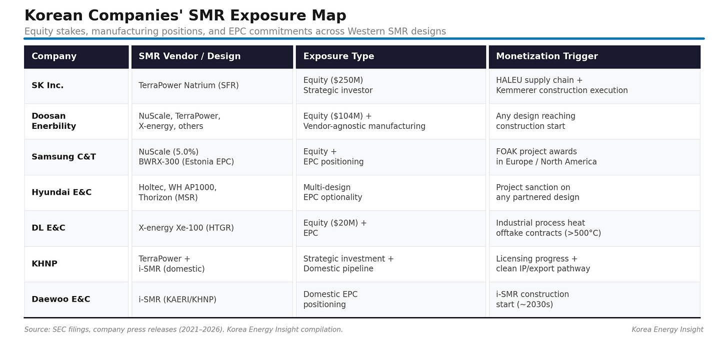 The roles are distinct. SK’s $250 million in TerraPower targets sodium-cooled fast reactors with DOE backing. Doosan Enerbility holds a vendor-agnostic position: as a manufacturer of reactor pressure vessels, steam generators, and heavy forgings, it supplies components to NuScale ($104 million invested), TerraPower, and others — whichever design builds first, Doosan’s order book fills. Samsung C&T (NuScale 5.0%, plus BWRX-300 EPC positioning in Estonia) and Hyundai E&C (Holtec, Westinghouse AP1000, and Thorizon’s molten salt reactor as of March 2026) are playing the EPC angle. DL E&C’s $20 million in X-energy targets the one SMR category where process heat creates a genuine economic differentiator. KHNP joined TerraPower’s investor base in January 2026. Daewoo E&C is securing its position in the only Korean-designed SMR pipeline through the domestic i-SMR program. (SEC filings; company press releases, 2021–2026)