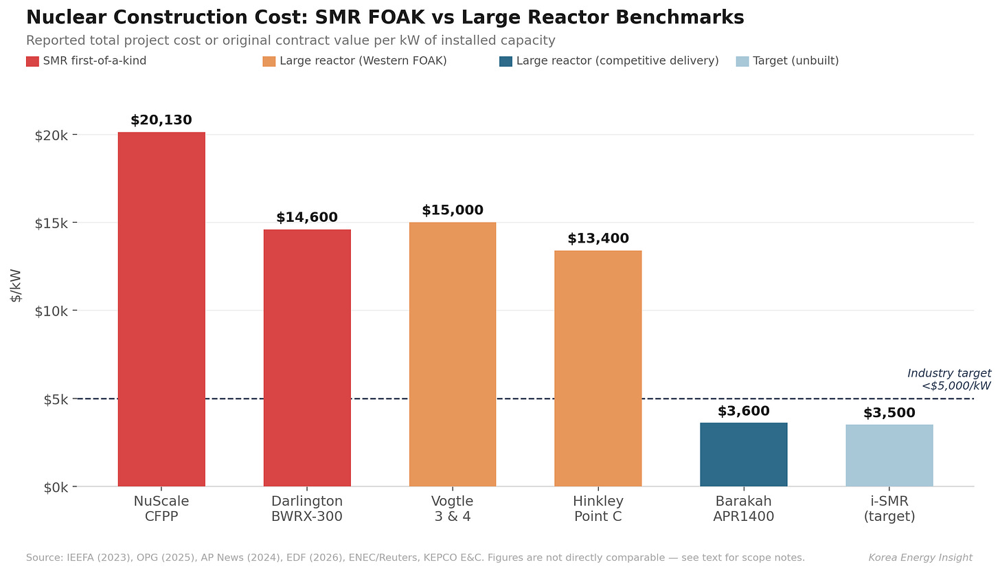 Every SMR vendor targets construction costs below $5,000/kW once modules are mass-produced. The first-of-a-kind (FOAK) reality is three to four times higher. Ontario Power Generation’s Darlington BWRX-300, the Western world’s most advanced SMR project, carries a first-unit reported total project cost of $4.5 billion (C$6.1 billion) for 300 MWe — over $14,600/kW before shared infrastructure. Korea’s own i-SMR targets $3,500/kW, but no unit has been built. NuScale also started at $5,000/kW. For reference, Korea built four APR1400 units at UAE’s Barakah for approximately $3,600/kW on the original contract value. These figures are not directly comparable — they mix contract prices, total project costs, and different scopes — but the order-of-magnitude gap between SMR FOAK costs and large-reactor benchmarks is real. (OPG project page, 2025; KEPCO (Korea Electric Power Corporation) E&C brochure; ENEC/Reuters)